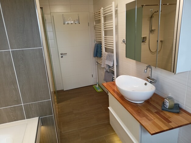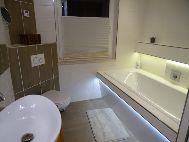 Das Badezimmer ist ausgestattet mit einer Badewanne, ...