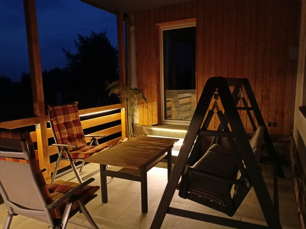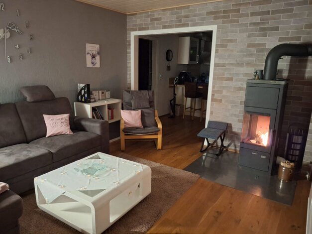 Das Wohnzimmer ist mit einem Kaminofen ausgestattet. Brennholz und Anzünder stehen kostenlos zur Verfügung